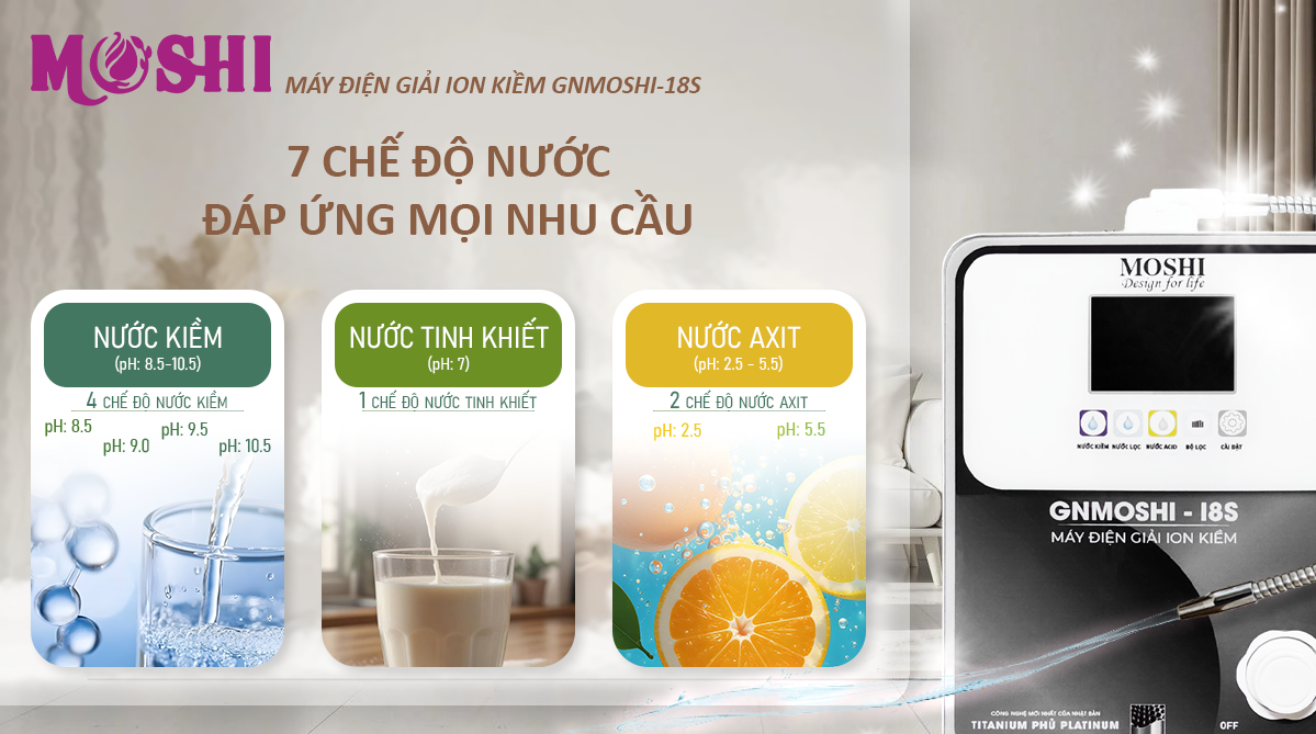 Loại nước: 7 loại (4 kiềm, 1 tinh khiết, 2 axit)