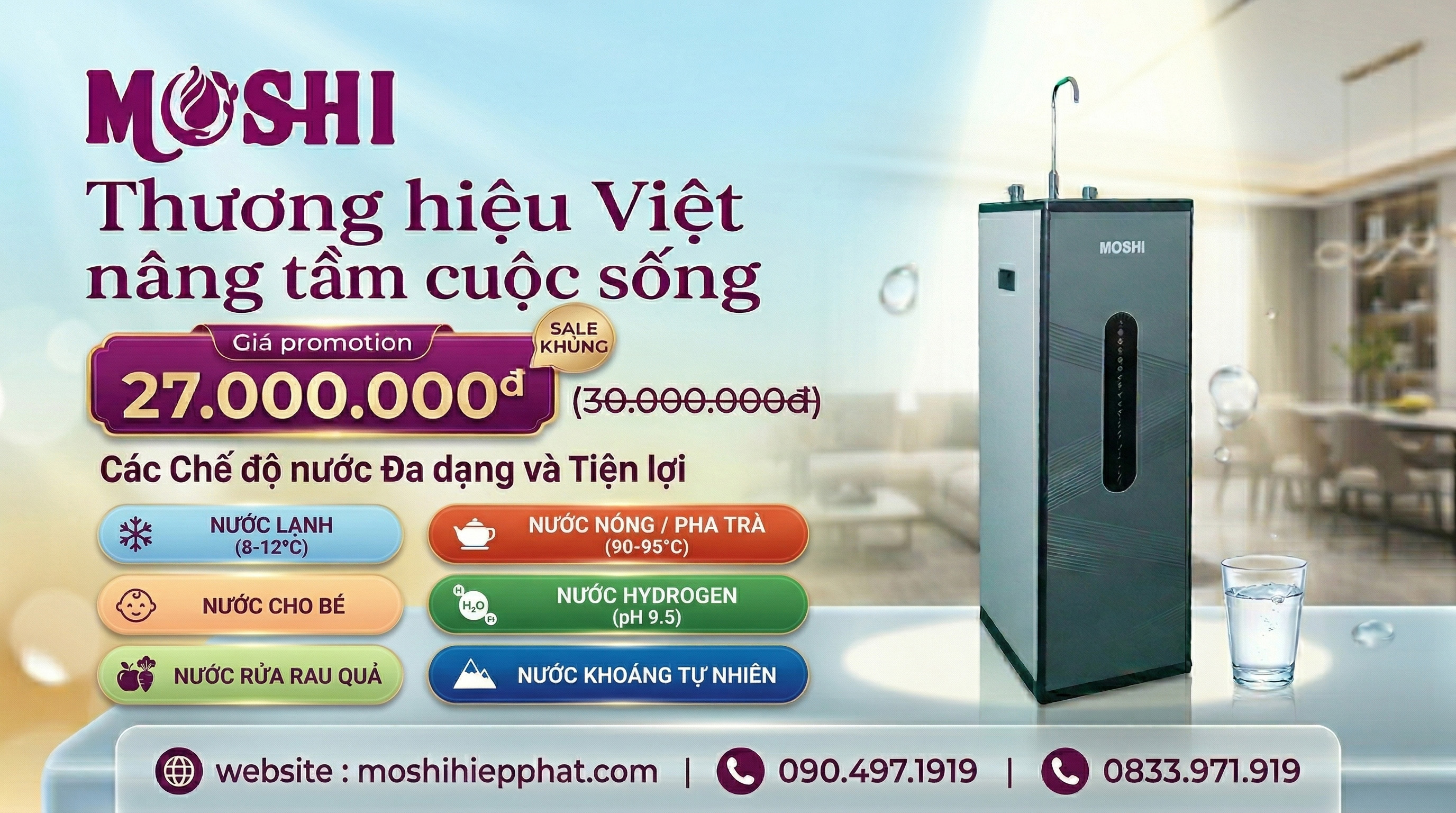 - Lõi hydrogen MOSHI : Mang đến chỉ số ORP ion âm chống oxy hóa vượt trội, hỗ trợ giảm thiểu gốc tự do, cải thiện sức khỏe và bổ sung khoáng chất thiết yếu.